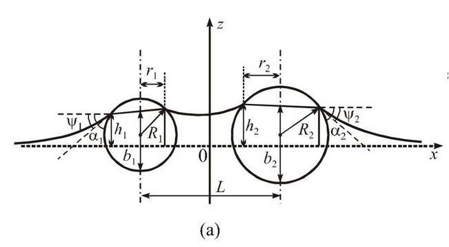 從能量的角度來(lái)看,液體表面能并不是由獨(dú)立放置單個(gè)小球時(shí)液面表面能的簡(jiǎn)單相加,還要加上一項(xiàng)因另外一個(gè)小球存在時(shí)的相互表面能,其與小球之間的距離直接相關(guān)。這種相互表面能表現(xiàn)為沿小球連線方向的橫向毛細(xì)力。