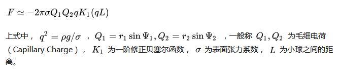 具體過(guò)程大家可以閱讀文末的參考文獻(xiàn),這里直接給出在小顆粒和液面小變形下假設(shè)下,兩小球之間橫向毛細(xì)力的表達(dá)式,