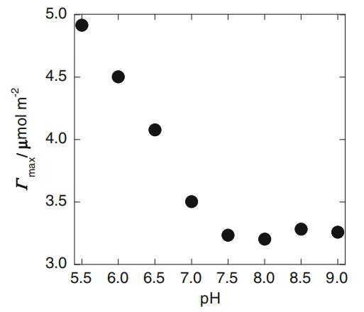 其中CS、R和T分別為表面活性劑總濃度、氣體常數(shù)和溫度。由于所有樣品溶液都含有過量的鈉鹽作為緩沖液并保持在恒定pH值,因此i值(濃度隨表面活性劑濃度變化的離子種類數(shù))取為1。圖5中繪制了最大值與pH值的關系圖。最大值在小于7.3的pH值下顯著增加,與cmc/C20比值的值相同。這些結果肯定表明,當pH值降至7.3以下時,在溶液表面用H+替換SLAS的Na+,也就是說,在pH值>7.3時,NDO癸?;“彼彡庪x子的反陽離子(LAS?)是空氣-水界面處的所有Na+。因此,估計了H+LAS的pKa值?另一方面,在含水體中,我們根據(jù)不同SLAS濃度下的pH值,確定了含水體相中HLAS的pKa值為3.3,該pH值在氮氣鼓泡的去火純水中。雖然我們還無法確定組裝的HLA的確切pKa值,因為尚未獲得HLA的最大值,但毫無疑問,其值大于含水體相中HLA單體的值3.3。一些文獻也報道了自組裝過程中pKa值的增加[12,13]。
