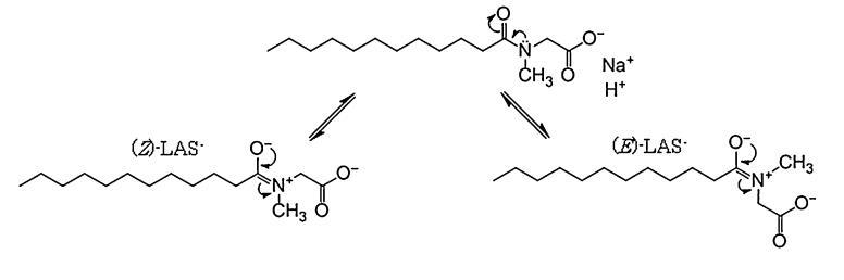 Bordes等人研究了氫鍵對甘氨酸鹽和肌氨酸鹽自組裝的影響[17]。Gad等人研究了具有不同碳鏈長度的N-?;“彼猁}的界面張力[3]。還對含有SLA的二元混合物與Gemini表面活性劑[18]和陽離子聚合物[19]進行了一些界面研究。然而,這些研究沒有考慮它們的pH影響。Tsubone等人在pH值為10.5[20]時對SLA進行了界面張力測量。然而,SLAS水溶液的界面張力在很大程度上取決于pH,在膠束前和膠束后區(qū)域中,當pH小于約7時,其值顯著下降。cmc和C20在較低pH下也會降低,但cmc/C20比在pH<7.3時增加。該比值的增加通常意味著親水頭的尺寸增加和/或與反陽離子的締合增加。在pH<7.3時,Γmax也急劇增加。這些結果清楚地表明,在空氣-水界面的較低pH區(qū)域,SLA的Na+陽離子被H+取代。向溶液中加入Tl+,證實LAS的界面張力?并且它們以H+<Na+的順序增加,這與這些結果一致。此外,我們使用1H-NMR和13CNMR研究了D2O和CD3OD中HLA和SLA的結構差異。根據(jù)這些結果,例如,來自LAS親水部分中1小時的所有信號?可以想象,HLA和SLA都具有共振結構,(Z)-LAS?和(E)-LAS?,如圖9所示。通過NMR[21,22]的膠束化也報告了這些SLAS異構體的存在。根據(jù)分裂峰的積分比,Z/E形式的豐度比確定為SLA為1:1,HLA為2:1。由于E型比Z型體積大,這可能是Γmax隨pH值增加而減小的第二個原因,直到pH值為7.3。另一方面,除了RB的各向異性(在pH<7時明顯增加)外,含水體中的膠束性質對pH的依賴性小于界面性質。然而,在pH值降低時,聚集數(shù)和流體動力學半徑的小幅度增加趨勢以及膠束核的微極性的減小趨勢可以很好地解釋為LAS親水性頭基團之間的靜電力減小?由Na+到H+的反陽離子置換引起,與界面性質的情況相同。雖然我們尚未確定界面和膠束中HLA的pKa值,但這些值應大于水溶液中的pKa值(pKa,bulk=3.3);界面處的值可能略大于膠束中的值。pH<7時體積較小的Z型的增加也與膠束性質相容,并可能與膠束親水部分附近RB各向異性的增加直接相關。