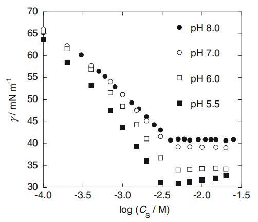 圖2界面張力(γ)與由50 mM磷酸鹽和硼酸鹽緩沖液控制的不同pH下總SLAS摩爾濃度(CS)的對數(shù)關系圖