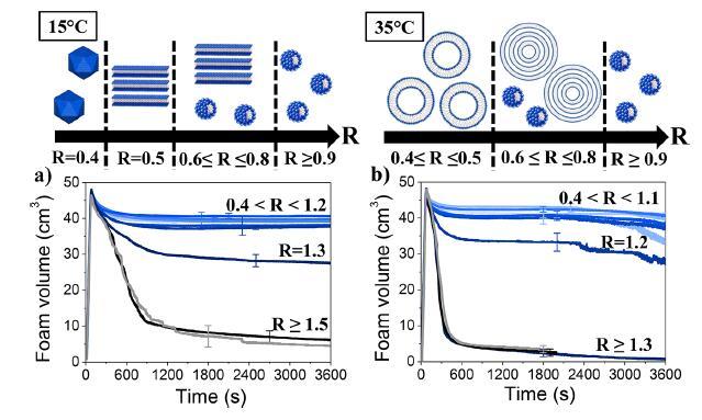 圖5:在兩種溫度下(a)15°C和(b)35°C下,通過手搖動不同摩爾比(R)產生的泡沫體積隨時間的變化。示意圖表示作為R和溫度的函數的大量自組裝體。
