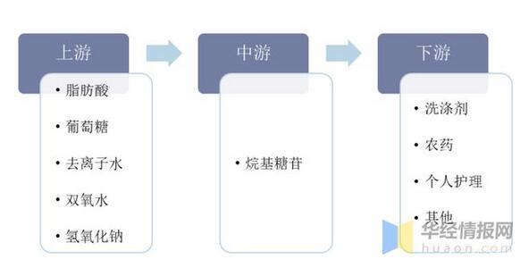 從產(chǎn)業(yè)鏈來看,烷基糖苷產(chǎn)業(yè)鏈由上游原材料、中游生產(chǎn)制造、下游應(yīng)用領(lǐng)域三部分構(gòu)成。產(chǎn)業(yè)鏈上游原材料主要包括脂肪酸、葡萄糖、去離子水、雙氧水、氫氧化鈉;產(chǎn)業(yè)鏈下游主要應(yīng)用于洗滌劑、個護(hù)、農(nóng)藥等領(lǐng)域。