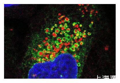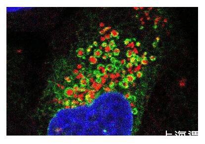 熒光顯微圖像顯示了內(nèi)質(zhì)網(wǎng)(綠色)像毯子一樣包裹住受損的溶酶體(紅色),細(xì)胞核以藍(lán)色顯示。