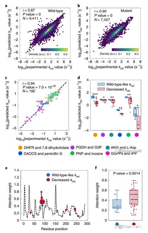 DLKcat可以捕獲kcat向精確的單個(gè)氨基酸替代方向的變化,從而能夠計(jì)算注意力權(quán)重,從而識(shí)別對(duì)酶活性產(chǎn)生重大影響的氨基酸殘基。氨基酸取代是酶進(jìn)化領(lǐng)域的一項(xiàng)強(qiáng)大技術(shù),通常用于探測(cè)酶催化機(jī)制。特別是,大多數(shù)替代實(shí)驗(yàn)在底物結(jié)合位點(diǎn)區(qū)域進(jìn)行誘變,因?yàn)榧僭O(shè)結(jié)合區(qū)域?qū)?duì)催化活性產(chǎn)生很大影響。然而,據(jù)報(bào)道,偏遠(yuǎn)地區(qū)會(huì)對(duì)催化活性產(chǎn)生深遠(yuǎn)影響。
