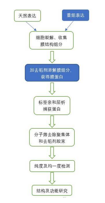 藍色背景分別是表達系統(tǒng)與去垢劑的選擇,是整個流程中至關(guān)重要的步驟。