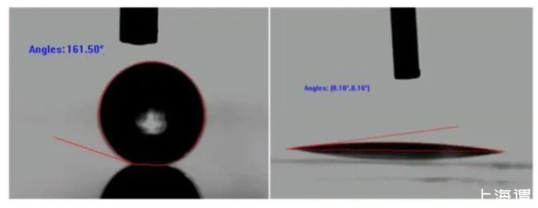 反之,對于疏水表面,固液界面處的表面張力可能非常大,以至于接觸角只有達(dá)到鈍角甚至趨近于180°才能達(dá)到平衡,此時的現(xiàn)象稱為非浸潤或者不能浸潤。而這種表面由于較高的疏水性被稱為超疏水表面。