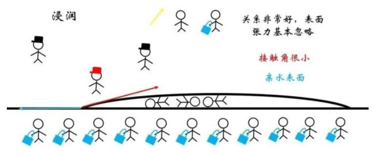 對于浸潤的情況,液體與固體物質(zhì)間的關(guān)系很好,最為極端地可以認(rèn)為該界面處的表面張力小到可以忽略。這樣一來,需要紅色和藍(lán)色的力的水平分量達(dá)到平衡,液滴的形狀趨于扁平。一般將氣液界面處張力與液固界面的夾角稱為接觸角,對于浸潤現(xiàn)象顯著的親水表面接觸角很小。