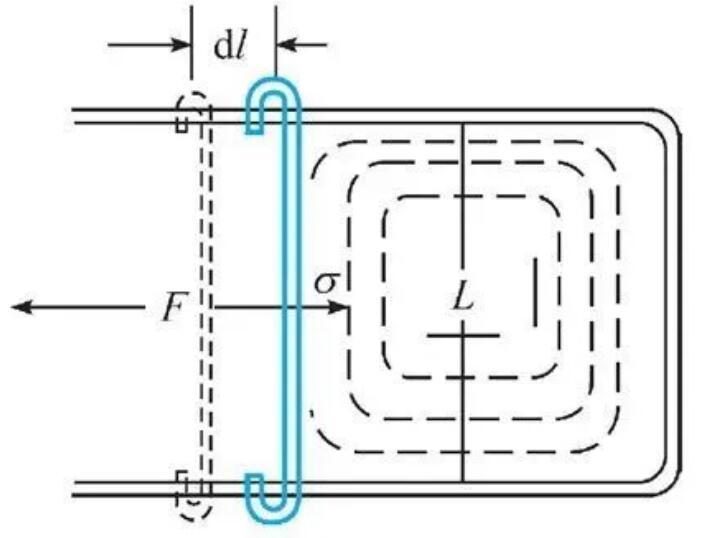 我們曾經(jīng)提到比表面能的單位是J/m,而將這個物理量從力的角度去理解對于處理一些問題更加直觀,我們常常將比表面能稱為表面張力。而J/m=N/m,并不是力的單位N,因此表面張力代表的是作用在單位長度的表面上的力。在下圖所示的實(shí)驗(yàn)中,肥皂水膜在力F的牽拉下長大,表面張力便是