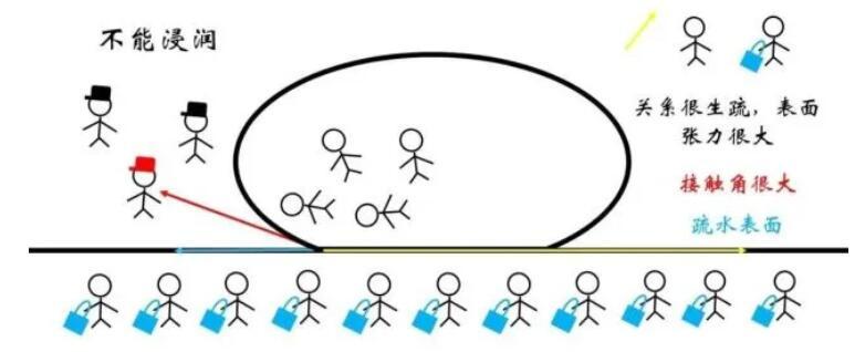 進(jìn)一步地,就涉及到一個問題:不同物質(zhì)的表面張力的大小與什么有關(guān)呢?在定性上,我們可以引入稱為親和度的概念,它反映了界面兩側(cè)物質(zhì)親疏關(guān)系。如果兩側(cè)的物質(zhì)很親和,那么待在內(nèi)部和表面其實(shí)區(qū)別不大,畢竟大家都合得來,因此表面張力相對較小。反之,如果兩側(cè)的物質(zhì)關(guān)系很疏遠(yuǎn),表面張力會很大。而這,正是浸潤現(xiàn)象產(chǎn)生的根源。