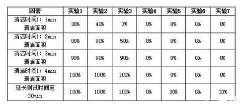 通過實驗1我們發(fā)現(xiàn):在浸泡清洗中各組分均能達到較好的清潔效果,但各組分最終清潔時間有差異,具體數(shù)據(jù)如下表