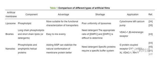 與雙胞體一樣,納米盤的第一步是基于洗滌劑的增溶,需要優(yōu)化所使用的洗滌劑的性質和濃度,這在納米盤重組中可能造成蛋白質活性損失,因此同樣存在洗滌劑使用相關問題的限制。表1[34,35,41-45]比較了脂質體、雙胞體、納米盤的組成及其優(yōu)缺點。