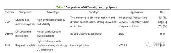 盡管SMA和DIBMA在一些MPs的分離純化中取得了成功[63],但存在SMA對二價陽離子耐受性低、DIBMA提取純度和穩(wěn)定性低的缺陷并且這兩種聚合物都有強烈的紫外吸收,可能干擾紫外檢測[57]。因此人們開始尋找非“烯烴-馬來酸支架”替代聚合物。最近,兩親性聚甲基丙烯酸酯聚合物(polymethacrylate,PMA)被證明可將脂質雙分子層溶解成納米圓盤。PMA比常見的苯乙烯-馬來酸聚合物具有潛在的優(yōu)勢,但目前PMA對于MPs的純化應用較少[64]。Lavington等[63]以神經(jīng)緊張素受體1(NTSR1)為對象,探索使用PMA的無洗滌劑純化。通過使用Sf9細胞中表達的NTSR1-eGFP融合蛋白,篩選了一系列的增溶條件,證明了溫度、pH、NaCl濃度以及聚合物和膜樣品的相對數(shù)量的重要性。此外還發(fā)現(xiàn)PMA對二價陽離子有一定耐受性。PMA溶解的NTSR1比洗滌劑溶解的NTSR1表現(xiàn)出更大活性,這表明PMALPs為NTSR1提供了更天然的膜環(huán)境[63]。因此,PMA是一種可替代SMA的MPs純化方法,在研究NTSR1和其他MPs方面具有良好的前景。表2比較了SMA、DIBMA、PMA的組成、優(yōu)缺點及其應用。
