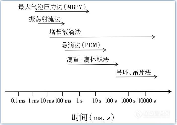 由于對(duì)DST時(shí)間范圍界定的不同,可運(yùn)用的測(cè)量手段也有所不同。王建坤等認(rèn)為,在達(dá)到靜態(tài)表面張力前的表面張力變化都可算是DST,這個(gè)時(shí)間范圍以幾毫秒到幾小時(shí)計(jì)??捎肳ilhelmy吊片法、DuNouy吊環(huán)法、滴重法、滴體積法、懸滴法、最大氣泡壓力法測(cè)定DST。