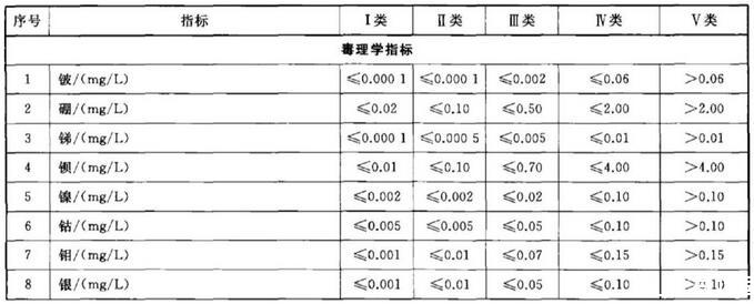 依據(jù)我國地下水質(zhì)量狀況和人體健康風(fēng)險(xiǎn),參照生活飲用水、工業(yè)、農(nóng)業(yè)等用水質(zhì)量要求,依據(jù)各組分含量高低(pH除外),分為五類。