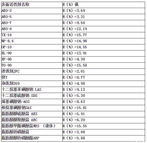 R值越大,表明凈洗能力越強(qiáng),該測(cè)試標(biāo)準(zhǔn)可用來(lái)表征表面活性劑對(duì)一般污垢的去除,不適用于反映油脂和蠟質(zhì)的去除能力。
