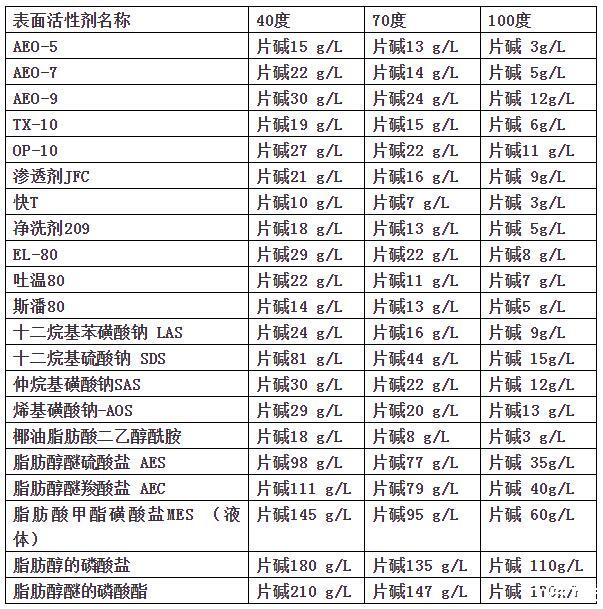 目前常見(jiàn)的表面活性劑耐堿性能如下表: