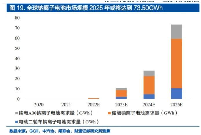 我們預(yù)計(jì)2025年鈉離子電池市場(chǎng)規(guī)模為398億元,2022-2025年年復(fù)合增速超300%,市場(chǎng)需求直接從21年0GWh增長(zhǎng)到25年的73.50GWh。其中,電動(dòng)二輪車領(lǐng)域,鈉離子電池需求規(guī)模從2021年的0GWh增長(zhǎng)到2025年的10.63GWh;儲(chǔ)能領(lǐng)域,鈉離子電池需求規(guī)模從2021年的0GWh增長(zhǎng)到2025年的48.74GWh;純電A00領(lǐng)域,鈉離子電池需求規(guī)模從2021年的0GWh增長(zhǎng)到2025年的14.13GWh。