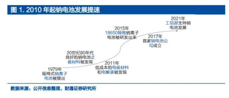 鈉電池隨著產(chǎn)業(yè)化加速,量產(chǎn)在即。1979年法國(guó)的Armand提出了“搖椅式電池”的概念,開(kāi)始鈉離子電池的研究。隨后Delmas和Goodenough發(fā)現(xiàn)了層狀氧化物材料可作為鈉電池正極材料,Stevens和Dahn發(fā)現(xiàn)硬碳材料作為負(fù)極有良好的鈉離子嵌脫性能。2010年以來(lái),鈉電池的研發(fā)進(jìn)程加速。2011年中科院物理所研究員團(tuán)隊(duì)開(kāi)始了鈉離子電池核心技術(shù)的研發(fā),自此以后開(kāi)發(fā)出低成本的電極材料。2017年國(guó)內(nèi)第一家專注于鈉離子電池研發(fā)和生產(chǎn)的公司中科海鈉成立。2021年寧德時(shí)代成功舉行了第一代鈉離子電池線上發(fā)布會(huì)。2022年,中科海納和傳藝科技均預(yù)計(jì)2023年量產(chǎn)其鈉離子電池。
