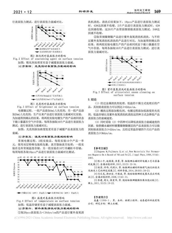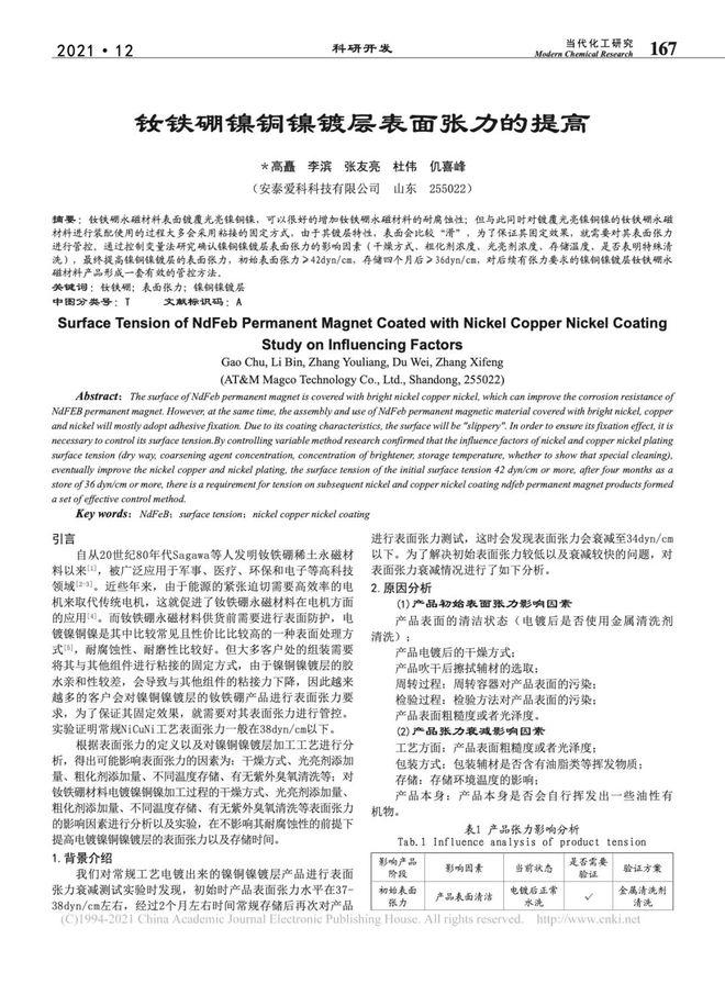 摘要:釹鐵硼永磁材料表面鍍覆光亮鎳銅鎳,可以很好的增加釹鐵硼永磁材料的耐腐蝕性;但與此同時(shí)對(duì)鍍覆光亮鎳銅鎳的釹鐵硼永磁材料進(jìn)行裝配使用的過(guò)程大多會(huì)采用粘接的固定方式,由于其鍍層特性,表面會(huì)比較"滑",為了保證其固定效果,就需要對(duì)其表面張力進(jìn)行管控。通過(guò)控制變量法研究確認(rèn)鎳銅鎳鍍層表面張力的影響因素(干燥方式、粗化劑濃度、光亮劑濃度、存儲(chǔ)溫度、是否表明特殊清洗),最終提高鎳銅鎳鍍層的表面張力,初始表面張力≥42dyn/cm,存儲(chǔ)四個(gè)月后≥36dyn/cm,對(duì)后續(xù)有張力要求的鎳銅鎳鍍層釹鐵硼永磁材料產(chǎn)品形成一套有效的管控方法。