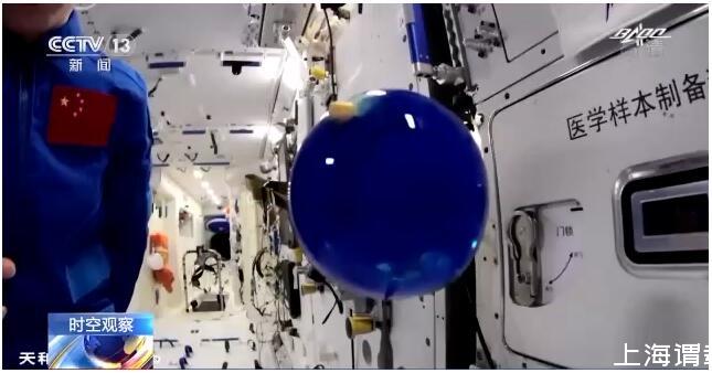 在泡騰片實驗中,王亞平向注入藍(lán)色顏料的水球中放入泡騰片,泡騰片入水后產(chǎn)生大量氣泡。