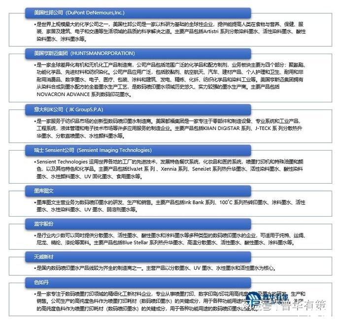 數(shù)碼噴印墨水市場呈現(xiàn)與數(shù)碼印花設(shè)備市場相近的市場競爭格局,由海外巨頭主導(dǎo)市場,如美國杜邦公司、美國亨斯邁集團(tuán)、意大利JK公司等。從全球范圍來看,目前歐洲、北美地區(qū)的數(shù)碼噴印技術(shù)仍處于較高水平,是率先對數(shù)碼噴墨印花技術(shù)實現(xiàn)產(chǎn)業(yè)化的地區(qū),受益于較高的環(huán)保標(biāo)準(zhǔn)和豐富的時尚原創(chuàng)設(shè)計產(chǎn)業(yè),歐洲、北美地區(qū)的數(shù)碼印花產(chǎn)品供需旺盛,數(shù)碼噴印應(yīng)用產(chǎn)業(yè)規(guī)模大且普及程度高,全球領(lǐng)先的數(shù)碼噴印墨水制造商多集中于此,亞太地區(qū)則以日本、韓國制造商為主。我國的數(shù)碼噴印墨水行業(yè)起步較晚,企業(yè)規(guī)模、研發(fā)能力以及產(chǎn)品穩(wěn)定性等方面參差不齊,且主要以中小型企業(yè)為主,但隨著最近幾年國產(chǎn)數(shù)碼噴印墨水的快速發(fā)展,我國也出現(xiàn)了少數(shù)綜合實力相對較強(qiáng)的專業(yè)生產(chǎn)商。國內(nèi)外主要墨水生產(chǎn)商情況如下: