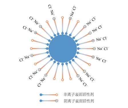 抑塵劑主要由陰離子表面活性劑、非離子表面活性劑以及其他助劑組成。其中,表面活性劑是一種具有兩親性的物質(zhì),加入少量能使其溶液體系的界面狀態(tài)發(fā)生明顯變化,是抑塵劑的重要組成部分。如圖4所示,煤塵表面暴露著大量的極性有機(jī)基團(tuán),水在煤塵表面很難發(fā)生潤濕行為;抑塵劑中的表面活性劑親油端與煤塵表面的有機(jī)基團(tuán)具有較好的相容性,能夠在煤塵表面定向排列并且將親水基團(tuán)引入煤塵表面,增加了水與煤塵之間的潤濕能力。無機(jī)鹽的引入對于陰離子表面活性劑具有增效作用。根據(jù)雙電層理論,雙電層可以分為緊密層和擴(kuò)散層,當(dāng)溶液中加入無機(jī)鹽后,無機(jī)鹽中的離子會(huì)壓縮擴(kuò)散層,使得擴(kuò)散層厚度減小,從而降低了界面能;同時(shí)其無機(jī)鹽離子還能減小雙電層中的靜電力作用,促進(jìn)了抑塵劑在煤塵表面的吸附,提高了潤濕性能。