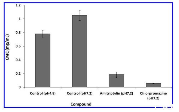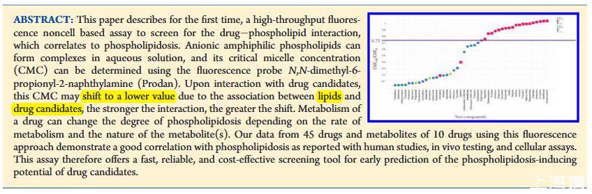 本文首次描述了一種與磷脂質(zhì)相關(guān)的高通量熒光。陰離子兩親磷脂可以在水溶液中形成復(fù)合物,其臨界膠束濃度(CMC)可以使用熒光探針N,N-二甲基-6-丙酰-2-萘胺(Prodan)測(cè)定。在與候選藥物相互作用時(shí),由于脂質(zhì)和候選藥物之間的關(guān)聯(lián),該CMC可能會(huì)轉(zhuǎn)變?yōu)檩^低的值,相互作用越強(qiáng),轉(zhuǎn)變?cè)酱?。藥物的代謝可以根據(jù)代謝速率和代謝物的性質(zhì)改變磷脂質(zhì)的程度。我們使用這種熒光方法從45種藥物和10種藥物的代謝物獲得的數(shù)據(jù)證明了與人體研究、體內(nèi)測(cè)試和細(xì)胞分析報(bào)告的磷脂沉積癥有良好的相關(guān)性。因此,該測(cè)定提供了一種快速、可靠且具有成本效益的篩選工具,用于早期預(yù)測(cè)候選藥物的磷脂沉積誘導(dǎo)潛力。