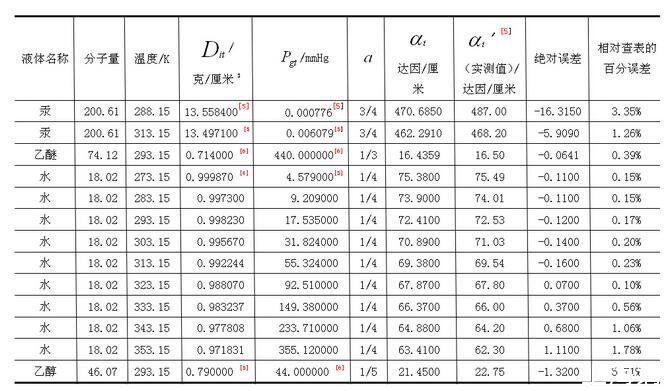 其中N0為阿伏伽德羅數(shù),M為摩爾質(zhì)量,Dit是液體的密度,Dgt是液體飽和蒸汽的密度,a為與液體種類相關(guān)的常量。為驗證(1)式的正確性,對汞、乙醚、水、乙醇等實際液態(tài)物質(zhì)的表面張力系數(shù)進行理論計算,并與實驗實測值'相比較,列于下表【3】: