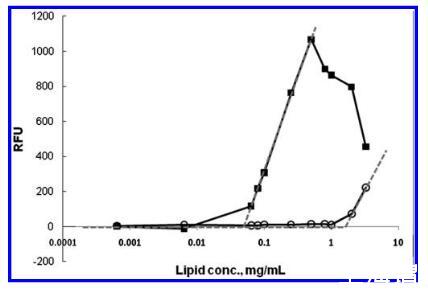 圖2.在不同濃度的脂質(zhì)diC8PS下記錄的熒光發(fā)射,范圍從64μg/mL到3.47 mg/mL。在對(duì)照中,添加純DMSO代替測(cè)試化合物(O),1.1 mg/mL的急劇上升標(biāo)志著diC8PS的CMC。將10μL的10 mM硫利達(dá)嗪(9)引入基質(zhì)(20 mM HEPES緩沖液中的diC8PS),CMC轉(zhuǎn)移到較低濃度(0.042 mg/mL)。RFU:相對(duì)熒光單位。