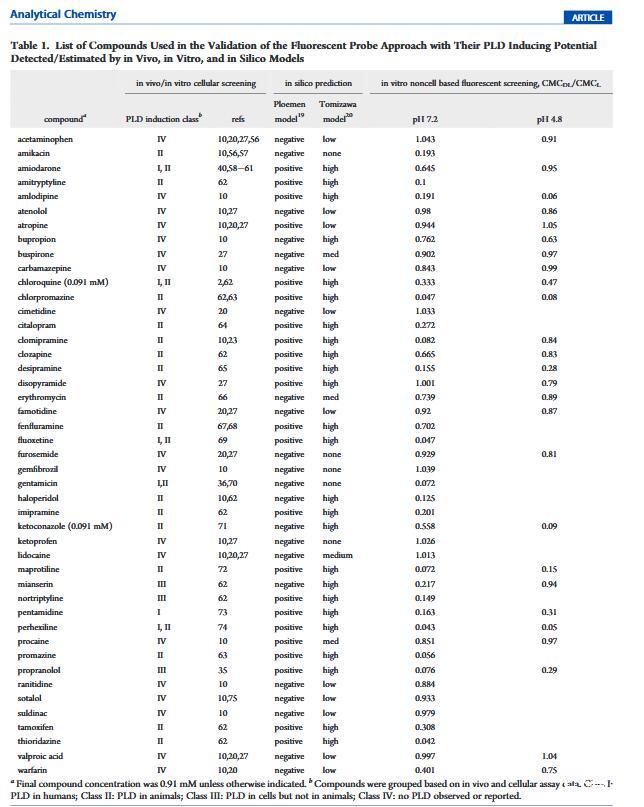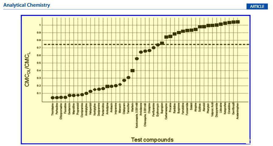 濃度依賴性。體內(nèi)研究中PLD的程度是劑量依賴性的。24,33在體外試驗中,濃度控制可用于估計劑量依賴性。一組七種報告的PLD誘導(dǎo)劑分別以三種不同的濃度進行了測試:910、91和9.1μM(圖4)。對于氯喹和酮康唑,要么它們在10 mM時不能完全溶解在DMSO中,要么在使用10 mM DMSO儲備液時與緩沖液混合后鹽析出來,它們的最高濃度點被去除。所有化合物都表現(xiàn)出對CMC的濃度依賴性,以不同程度改變PLD誘導(dǎo)潛力。即使在910μM時,芬氟拉明似乎也是一種弱誘導(dǎo)劑,而硫利達(dá)嗪在不同濃度之間顯示出顯著變化。根據(jù)該體外數(shù)據(jù),在9.1μM的最低濃度下,七種化合物中沒有一種似乎能夠誘導(dǎo)PLD。復(fù)合自聚合。與磷脂類似,大多數(shù)PLD誘導(dǎo)劑是兩親性的。盡管帶有不同的電荷跡象,但它們也可以聚集并形成膠束。拉貝洛爾20,34和奎尼丁35被報道為PLD誘導(dǎo)劑;然而,在所應(yīng)用的測試條件下,我們無法確定任何一種藥物脂質(zhì)復(fù)合物的CMC。獲得的RFU值等于或低于空白(含熒光探針但不含脂質(zhì)的化合物)中的值。進一步研究了不同藥物濃度但沒有脂質(zhì)(0 mg/mL脂質(zhì)),并且在無脂質(zhì)測定緩沖液中,拉貝洛爾和奎寧的CMC值分別為26和20μM。這些CMC值遠(yuǎn)低于這些化合物在PLD篩選中的測試濃度,并且懷疑化合物的自聚集會干擾藥物脂質(zhì)復(fù)合物形成的檢測,從而使CMCDL無法確定。