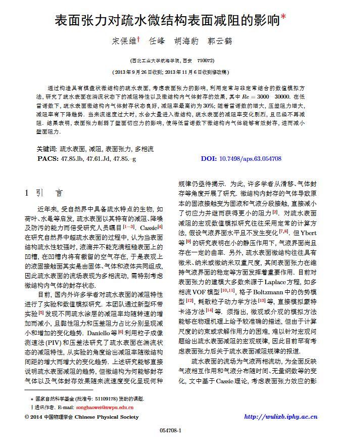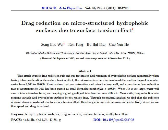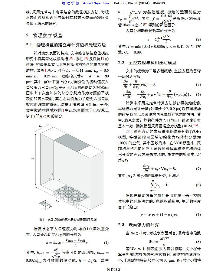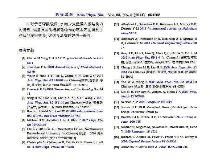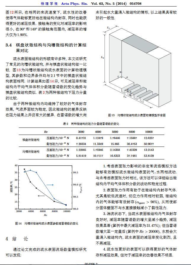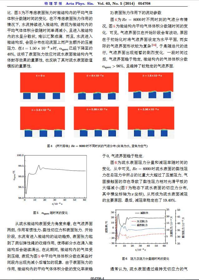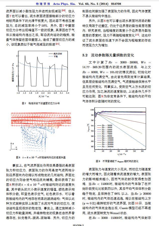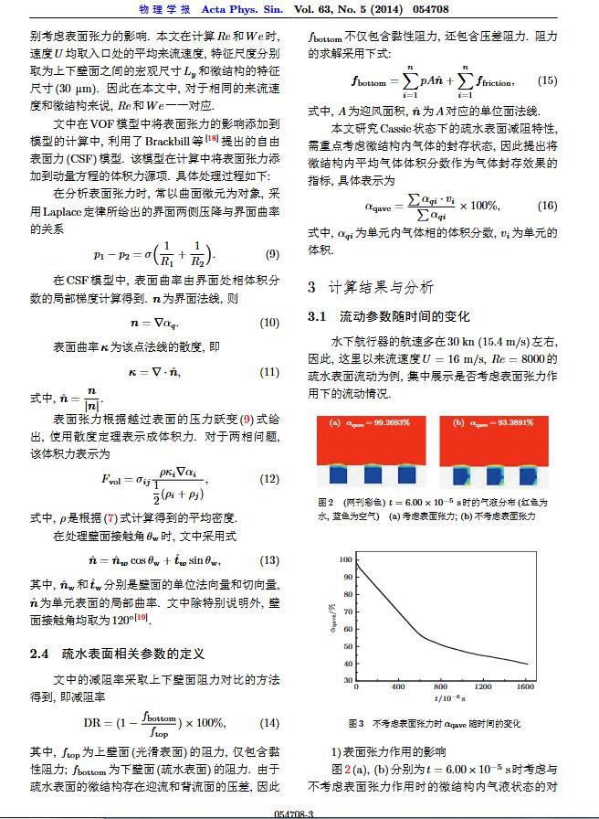 通過(guò)構(gòu)造具有棋盤(pán)狀微結(jié)構(gòu)的疏水表面,考慮表面張力的影響,利用定常與非定常結(jié)合的數(shù)值模擬方法,研究了疏水表面在湍流狀態(tài)下的減阻特性以及微結(jié)構(gòu)內(nèi)氣體封存的效果,其中Re=3000—30000.在低雷諾數(shù)下,疏水表面微結(jié)構(gòu)內(nèi)氣體封存狀態(tài)良好,減阻率最高約為30%;隨著雷諾數(shù)的增大,壓差阻力增大,減阻率有下降趨勢(shì).當(dāng)來(lái)流速度過(guò)大時(shí),水會(huì)大量進(jìn)入微結(jié)構(gòu),疏水表面的減阻率變化劇烈,且已經(jīng)不再減阻.結(jié)果表明,表面張力削弱了壁面切應(yīng)力的影響,使得低雷諾數(shù)下微結(jié)構(gòu)內(nèi)氣體能夠有效封存,進(jìn)而減小壁面阻力.