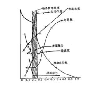 溶液體相中出現(xiàn)膠束后,繼續(xù)增加濃度時(shí),體相中單體的濃度將不再上升,因此從理論上來(lái)講,凡是利用膠束形成而發(fā)生不連續(xù)變化的性質(zhì)都可以被用來(lái)測(cè)量CMC。但是需要注意,有些性質(zhì)對(duì)單體濃度敏感、有些對(duì)膠束敏感,因此同一個(gè)表面活性劑用不同的方法測(cè)量的CMC數(shù)值存在微小的差異是正常的。測(cè)量臨界膠束濃度的方法很多,比較常用的有表面張力法、電導(dǎo)法、染料法、增溶法、滲透壓法、脈沖射解法、熒光法、超聲吸附法、濁度法、pH值法、流變法、離子選擇性電極法和循環(huán)伏安法等。
