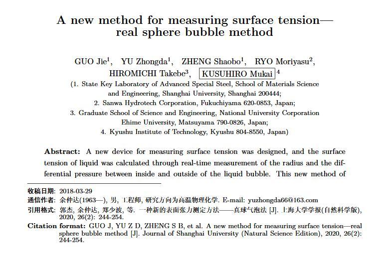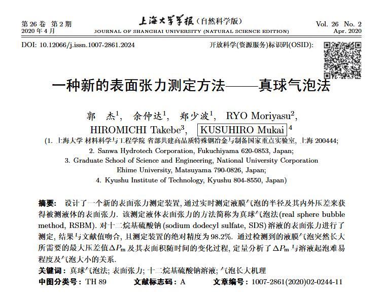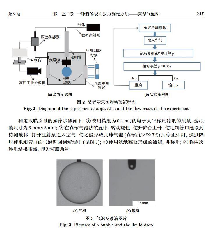 設(shè)計(jì)了一個(gè)新的表面張力測定裝置,通過實(shí)時(shí)測定液膜氣泡的半徑及其內(nèi)外壓差來獲得被測液體的表面張力。該測定液體表面張力的方法簡稱為真球氣泡法(real sphere bubblemethod,RSBM)。對十二烷基硫酸鈉(sodium dodecyl sulfate,SDS)溶液的表面張力進(jìn)行了測定,結(jié)果與文獻(xiàn)值吻合,且測定裝置的絕對精度為98.2。通過檢測到的液膜氣泡突然長大所需要的最大壓差值及其表面積隨時(shí)間的變化過程,定量分析溶液起泡難易程度及氣泡大小的關(guān)系。