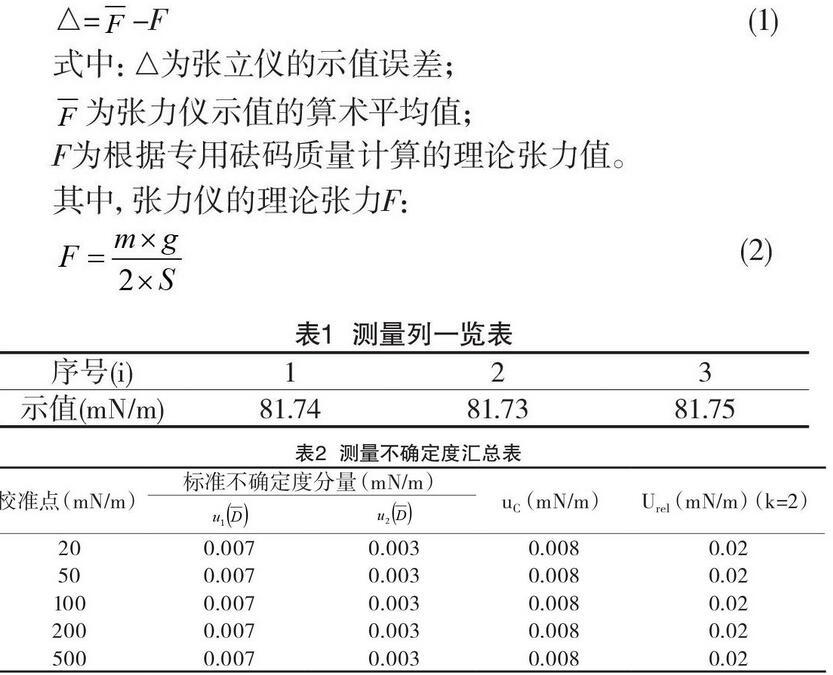 根據JJF 1464-2014《界面張力儀校準規(guī)范》規(guī)定,張力儀的測量范圍為20~500mN/m,其測量不確定度見表2。