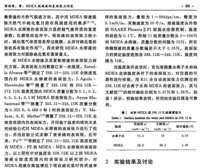 MDEA脫硫液的表面張力研究