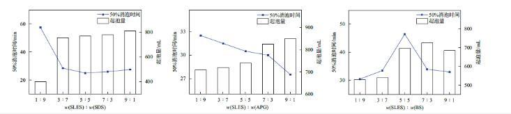 圖3復(fù)配組分對50%消泡時間和泡沫量的影響