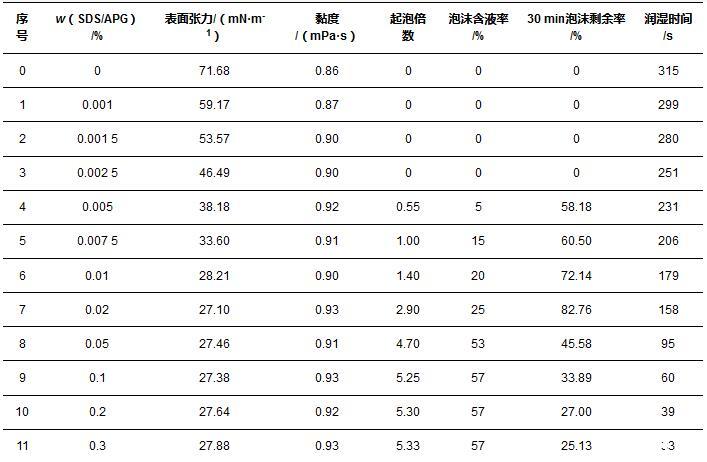 2)在SDS和APG構(gòu)成的表面活性劑體系中,溶液表面張力的降低,有利于起泡、泡沫攜液、泡沫穩(wěn)定性和潤濕能力的提升。當(dāng)質(zhì)量分數(shù)大于cmc時,表面張力幾乎不變;在測定范圍內(nèi),隨著質(zhì)量分數(shù)增加,溶液起泡能力呈現(xiàn)先增加后平穩(wěn)的趨勢,泡沫穩(wěn)定性降低,潤濕性能提升。