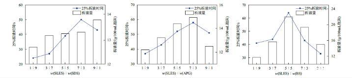 實驗測得SLES,SDS,APG和BS在w=0.2%時的25%析液時間依次為33,30,21和25 s,100 mL泡沫析液量依次為15.97,12.92,13.69和10.89 g。由圖4可知,SLES/SDS無明顯增效,隨著SLES質(zhì)量分數(shù)的增加,復(fù)配組分的析液量和25%析液時間接近SLES單組分。SLES/APG的25%析液時間增加,泡沫穩(wěn)定性較好,其中w(SLES):w(APG)=7:3的25%析液時間、100 mL泡沫析液量依次為58 s、14.92 g。SLES/BS的析液量和泡沫穩(wěn)定性均有所提升,其中w(SLES):w(BS)=5:5的25%析液時間、100 mL泡沫析液量依次為64 s、21.95 g。
