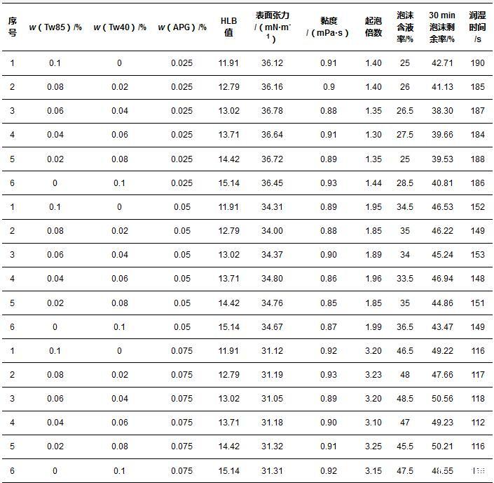 選用非離子-非離子表面活性劑復(fù)配體系,以吐溫85(Tw85)、吐溫40(Tw40)、烷基糖苷(APG)復(fù)配組分作為實驗對象,實驗中發(fā)現(xiàn)Tw85和Tw40混合溶液無法產(chǎn)生穩(wěn)定泡沫,因此將Tw85和Tw40復(fù)配組分作為HLB值調(diào)節(jié)組分,添加APG作為輔助起泡劑。實驗結(jié)果見表1。