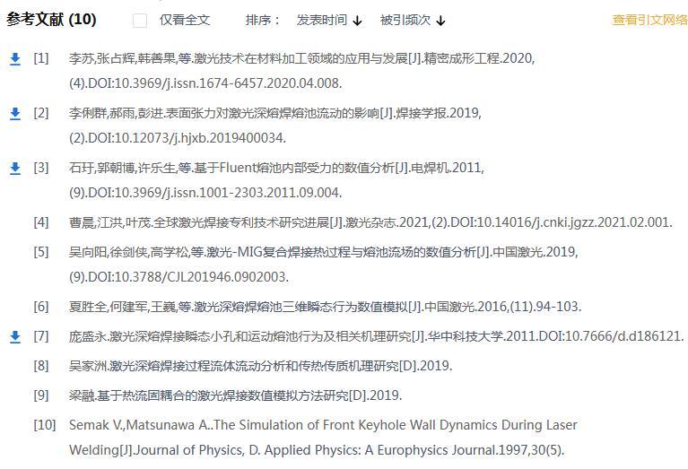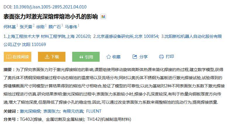 【摘要】:為了探究表面張力對于激光焊接熔池的影響,課題組使用移動旋轉(zhuǎn)高斯體熱源來簡化焊接的熱過程,建立數(shù)學(xué)模型,獲得了奧氏體不銹鋼深熔焊接過程中動態(tài)熔池的溫度場以及流場分布;同時以奧氏體不銹鋼為基板進(jìn)行激光焊接試驗,試驗得到的焊縫橫截面尺寸同模型計算結(jié)果得到的熔池尺寸相吻合,驗證了模型的可靠性;以此為基礎(chǔ)對2種不同表面張力系數(shù)下激光焊接熔池過程進(jìn)行仿真。