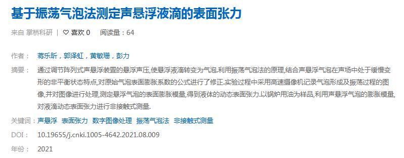 以鍋爐用油為樣品,利用聲懸浮氣泡的膨脹模量,對液滴動態(tài)表面張力進行非接觸式測量。