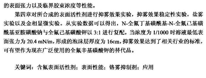第四章對(duì)所合成的表面活性劑進(jìn)行抑霧效果實(shí)驗(yàn),抑霧效果穩(wěn)定性實(shí)驗(yàn),鹽霧實(shí)驗(yàn)以及金相顯微實(shí)驗(yàn)。從實(shí)驗(yàn)數(shù)據(jù)可以得出,N-全氟丁基磺?;?N-全氟己基磺酰基亞胺磺酸鈉與全氟己基磺酸鉀以3:1進(jìn)行復(fù)配,當(dāng)濃度為1/1000時(shí)溶液最低表面張力為20.4mN/m,形成的泡沫層厚度為16cm,抑霧效果達(dá)到了相關(guān)行業(yè)的標(biāo)準(zhǔn),可有望作為現(xiàn)在廣泛使用的全氟辛基磺酸鉀的替代品。