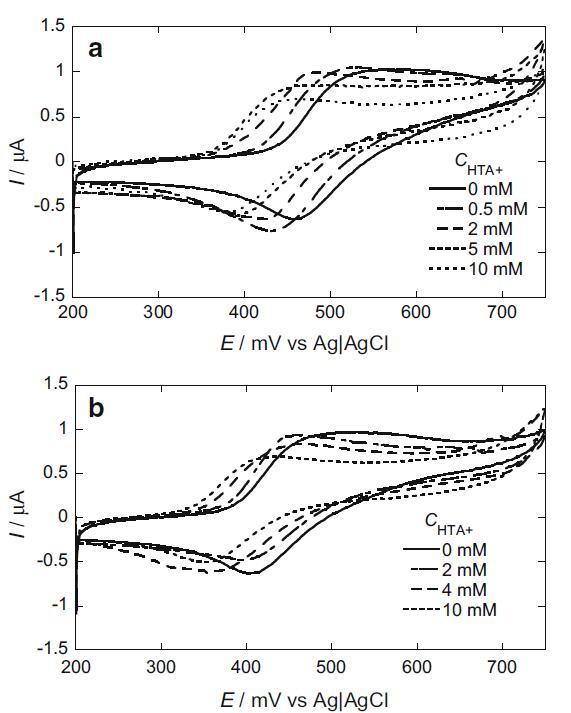 我們還研究了 HTA+ 陽離子的影響(圖 6)。 來自界面張力測量的 HTA+ 離子的 cmc 與圖 6 標題中所述的 CV 測量溶液相同,為 3.95 mM。 I2/I? 的陽極和陰極峰均高于不存在 HTA+ 時的峰。 陽極和陰極峰值電流的增加是由于被捕獲的 I? 和 I2 從 hp-β-CD 釋放到主體中,這是由 hp-β-CD 腔中的 I? 和 I2 置換引起的與 HTA+。 另一方面,隨著 HTA+ 的濃度增加到 cmc 以上,陽極和陰極峰值電流都變得低于預膠束濃度下的峰值電流。 在 I2 和 I- 鍵合到膠束經(jīng)歷電子轉(zhuǎn)移之前,膠束必須轉(zhuǎn)向,使 I2 和 I- 面向電極表面。 它導致峰值電流的降低。 此外,陽極和陰極峰值電位都向負方向移動。 這表明溶解在 HTA+ 膠束中的 I2 比鍵合到 HTA+ 膠束表面的 I- 更穩(wěn)定。 隨著 HTA+ 濃度增加到 5 mM,在 330 mV 處觀察到一個尖銳的吸附減少峰。 已知在不存在任何表面活性劑的情況下,在鉑電極表面形成的 I2 會吸附在電極表面 [19]。 在我們的系統(tǒng)中,HTA+ 在低 HTA+ 濃度下抑制了 I2 的吸附。 然而,隨著HTA+濃度的增加,形成了HTA+單層,導致電極表面HTA+單層中的I2被吸收。 隨著 HTA+ 濃度增加至 10 mM,吸附還原峰消失。 在這個濃度下,在電極表面形成的 I2 溶解到 HTA+ 膠束中。 因此,沒有觀察到吸附峰。