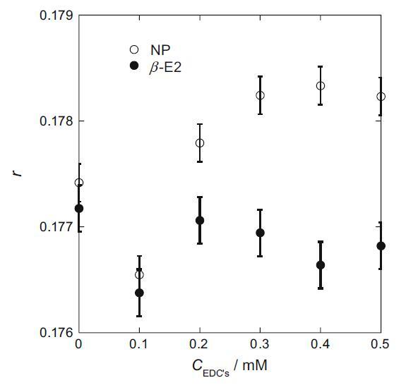 RB 分子在膠束表面區(qū)域溶解得越硬,r 值越大[15]。 r 值的變化如圖 3 所示。在 0.1 mM 時,r 值下降。 這表明 EDCs 開始溶解到膠束中擾亂了 RB 分子在膠束表面的緊密堆積。 隨著NP濃度的增加,r值增加。 然而,隨著β-E2濃度的增加,r值一度恢復并似乎一點點下降。 這表明 NP 的增溶使膠束表面更加剛性,而 β-E2 的增溶則沒有。 NP在結(jié)構(gòu)上更類似于HTA+。 因此,NP在膠束中的HTA+離子頭之間增溶,降低了膠束表面離子頭的靜電斥力,使膠束更加穩(wěn)定和剛性[16]。 另一方面,β-E2 似乎會干擾 HTA+ 的取向并降低膠束表面的剛度。