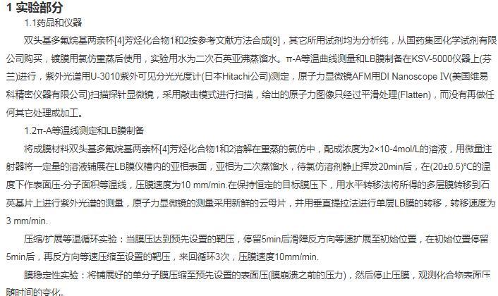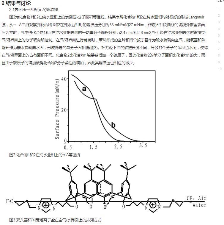 Langmuir-Blodgett膜技術(shù)(LB膜)是一種精確控制薄膜厚度和分子排列的單分子膜沉積技術(shù),即在水氣界面上能將成膜材料分子加以緊密有序地排列,形成單分子層,然后再轉(zhuǎn)移到固體襯底上的制膜技術(shù),利用該技術(shù)可以將功能化合物的光學(xué)、電磁學(xué)、分子識別與催化等性質(zhì)轉(zhuǎn)移到膜材料中。杯芳烴是繼環(huán)糊精、冠醚之后出現(xiàn)的第三代超分子主體分子,它具有空腔可調(diào)節(jié),構(gòu)象可變換,并易于化學(xué)改性和修飾等特點(diǎn),特別是對它進(jìn)行適當(dāng)修飾以后的化合物在材料化學(xué),配位化學(xué),生物化學(xué)等領(lǐng)域表現(xiàn)出潛在的應(yīng)用前景與研究價值。基于上述認(rèn)識最近我們合成了雙頭基多氟烷基兩親杯芳烴化合物1和2(圖1),并對該化合物在空氣/水相界面的成膜性能以及LB膜的結(jié)構(gòu)進(jìn)行了研究。