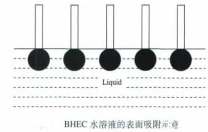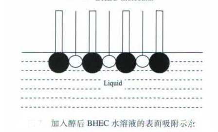 乙醇和正丁醇屬于一元醇,這兩種醇的加入能使BHEC水溶液的表面張力減小。當(dāng)未加入一元醇時(shí),BHEC溶于水后,BHEC分子能自發(fā)地吸附在溶液的表面,使溶液的表面張力降低,表面吸附的BHEC分子越多,溶液表面張力的降幅越大,當(dāng)然這其中有一個(gè)吸附飽和的問(wèn)題。但由于BHEC分子在水中處于空間交聯(lián)網(wǎng)絡(luò)結(jié)構(gòu),其定向排列時(shí)分子間存在一定的空間(見(jiàn)上圖)。加入乙醇或正丁醇后,醇分子可以插入BHEC分子間的空隙,使溶液表面吸附的分子達(dá)到緊密排列的狀態(tài)(見(jiàn)下圖),導(dǎo)致BHEC水溶液的表面張力繼續(xù)降低。