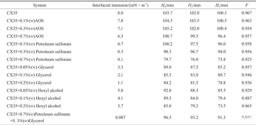 CX35雖具有降低油水界面張力的能力,但加入CX35后,油水界面張力仍大于10-1mN/m數(shù)量級(jí)。離子型表面活性劑與醇混合可降低油水界面張力,但醇會(huì)影響驅(qū)油劑的起泡性能。不同復(fù)配體系的油水界面張力見表1。由表1可看出,石油磺酸鹽降低界面張力的效果尤為突出。這是因?yàn)?,石油磺酸鹽含苯環(huán)及類苯結(jié)構(gòu),且苯環(huán)上有疏水碳鏈,與原油中的瀝青質(zhì)和芳烴等物質(zhì)結(jié)構(gòu)相似,故石油磺酸鹽易吸附在油水界面上從而降低油水界面張力。同時(shí),石油磺酸鹽還可提高驅(qū)油劑在空隙中的洗油效率,也可通過乳液產(chǎn)生的阻力提高驅(qū)油劑的波及效率。在m(CX35)∶m(石油磺酸鹽)∶m(甘油)=1∶0.7∶0.3的條件下得到的ZX35的起泡高度可達(dá)到95 mm以上,穩(wěn)泡能力達(dá)到0.946。