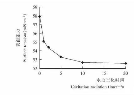 空化時(shí)間對(duì)原糖溶液表面張力的影響配置濃度為0.15g/mL的原糖溶液3.5L,水浴加熱溶液到60℃,在0.2 MPa壓力下通過(guò)空化裝置循環(huán)不同的時(shí)間(1,2,5,10,20min),測(cè)定空化前后原糖溶液的表面張力的變化。