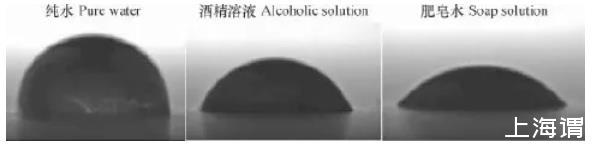 由上式可以看出,基質(zhì)吸力的大小與表面張力、接觸角和曲率半徑有關(guān)。其中,基質(zhì)吸力的大小與表面張力成正比,與彎液面曲率半徑成反比。因此,表面張力和曲率半徑的變化均會導(dǎo)致基質(zhì)吸力的改變。在環(huán)境溫度為25℃時,通過JC2000型接觸角測量儀對三種試樣的孔隙液體進(jìn)行接觸角測量。得到三種不同表面張力液滴的幾何形態(tài)圖如圖1所示,測量可得純水、酒精溶液和肥皂水對應(yīng)的接觸角分別為85°、65°和42°,而在25℃環(huán)境下,純水、20%酒精溶液、2 g L-1肥皂水的表面張力系數(shù)分別為:7.1×10-2N m-1、4.1×10-2N m-1、2.9×10-2N m-1。表面張力是決定彎液面形狀的主要因素之一,會影響曲率半徑和接觸角的大小。很顯然,表面張力大的液體接觸角變大,曲率半徑變小。圖1中水滴表面張力大于酒精溶液,但形成的彎液面半徑卻要小于酒精溶液,同樣的,酒精溶液形成的彎液面半徑又小于肥皂水。曲率半徑越小,土體中的基質(zhì)吸力越大??紫端砻鎻埩澮好娴那拾霃疆a(chǎn)生改變從而對基質(zhì)吸力產(chǎn)生影響,最終影響土壤的收縮開裂。
